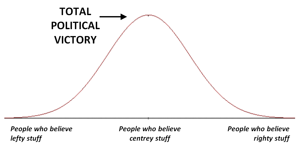 On this basis, the closer you move to the centre (being neither left nor right), the closer you get to that big peak of potential votes. Do the market research, find the sweet spot in the distribution, pitch to it incessantly and you’re home and hosed.
