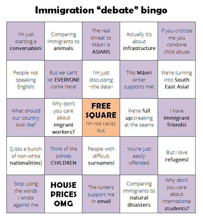 Because I am tired. I am so very tired of this little dance we go on, every single time a Pākehā dude (usually) opens his mouth to complain about “floods” or “waves” of immigrants or wants to start off “an important conversation” about immigration by observing that the queue at KMart made him feel like he was in South East Asia. I am tired of the disingenuous defenders insisting that we stop talking about the actual words the grown man who works in a communication-based job actually wrote. I am tired of the expectation to buy into the charade that he just doesn’t understand the basic implications of his words, to soothe the troubled brows of people who think being called racist is the literal worst thing that can happen to a living being.